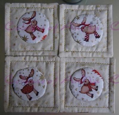 Und weitere MugRugs, diesmal gestürzt. Ich habe mich mit der Volumenvlies verstärkten Applikation dermaßen rumgeärgert - einen Kreis habe ich zweimal aufgetrennt und neu angenäht, ehe er mir gefiel -, dass ich dann auf die "schnelle" Variante zurückgegriffen habe. Ich lernte: 1. Als Anfänger ist Verstürzen auch nicht schneller und 2. Binding sieht definitiv besser aus