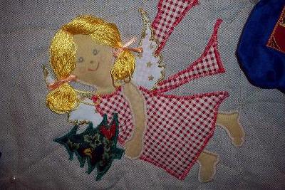 Ich habe ihn mit Goldfaden genäht und Perlen draufgenäht .Den Engel hab ich draufappliziertund mit Zickzack umrandet.