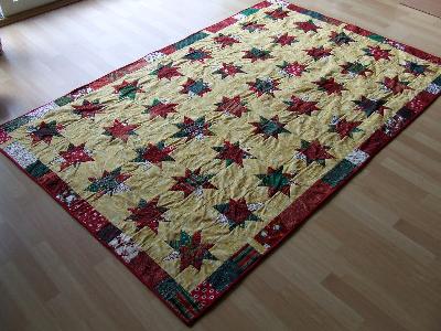 Die Sterne sind aus Weihnachtsstoffen aus meiner Sammlung, lediglich den hellen Stoff habe ich dazu gekauft. Die Decke ist ca. 130 mal 190 cm groß.