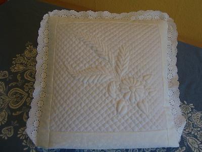 Ich habe meinen Trapunto - Probeblock jetzt zu einem Kissen verarbeitet. Da ich eh geplant habe irgendwann einmal einen weißen Quilt zu nähen, ist das meine ständige Erinnerung, dazu den passenden Begleiter zu machen.....
