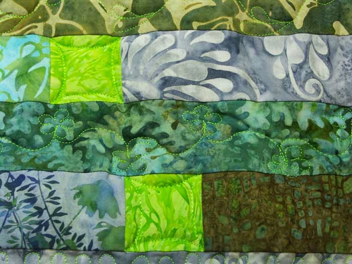 Die hellen Quiltlinien stellen eine schöne Verbindung des Ganzen zu den kleinen hellgrünen Quadraten her. Toll!