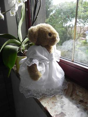 Wir haben vor 16 Jahre zur Hochzeit ein ganz süsses Teddypäärchen bekommen, was als Braut und Bräutigam angezogen ist. Aber leider zerfährt jetzt das Brautkleid. Aber ich möchte, dass die Braut wieder ein schönes Outfit bekommt. Ist hier jemand, der mir so ein Kleidchen - natürlich gegen Bezahlung - nähen würde? Das alte Kleid ist noch vorhanden, Der Teddy ist knapp 30 cm gross. Das Kleid ist sehr aufwendig mir Rüschen usw., dass muss es nicht sein, aber man sollte es schon als Brautkleid erkennen können. Der Bräutigam hat einen Frack und Zyllinder an.
