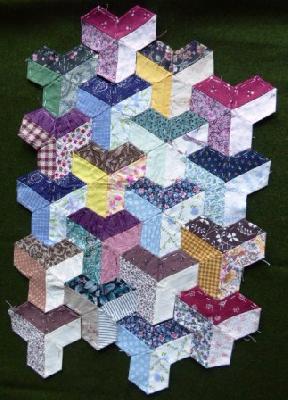 Wie witzig, heute ist mir ganz zufällig mein ältestes UFO fast in die Hand gefallen. Es muss so ungefähr aus dem Jahr 1988 sein, denn ich hatte ca. 1986 mit dem Patchwork angefangen und in einem amerikan. Heft hatte ich eine Jacke gesehen, deren Ärmel aus "Inner City"-Teilen gemacht waren. So eine wollte ich auch. Na ja, ehrlich gesagt, ich weiß nur noch, dass ich erst ein Probestück machen wollte - und dabei ist es geblieben. Ich hatte keine Schablonen, konnte natürlich nicht im Internet nachsehen und habe auf gut Glück gearbeitet. Die Hexas sind ungefähr 4 cm im DM und auf Vlieseline gebügelt. Warum ich das gemacht habe - keine Ahnung mehr. Patchworkstoffe? Vielleicht 1 oder 2, alles andere Reste von Kleidern usw.