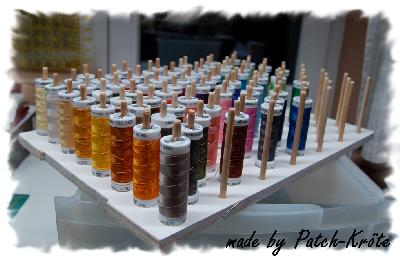 Für mein gutes Quiltgarn hab ich mir von einem Bekannten, der viel mit Holz arbeitet zwei Bretter zuschneiden und mit Löchern versehen lassen.