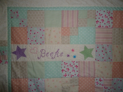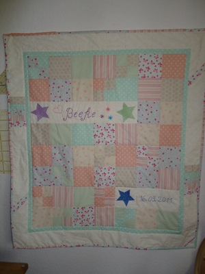 So heute zeige ich euch mal - was ich vorige Woche gewerkelt habe - einen kleinen Baby Quilt für Beeke die vorgestern das Licht der Welt erblickt hat - er ist 90 x 100 cm groß und die Farben, Muster und Stoffe wurden von den Freundinnen der Mutti ausgesucht - die dann in der kommenden Woche den Quilt überreichen wollen - nun hoffe ich noch das Ihnen der Quilt auch gefällt.
