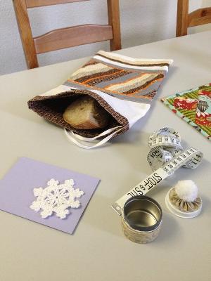Es ist ein wunderschöner Brotsack, in den geliebten Farben von Grau und Orange, dann ein wahnsinnig langes Messband (3 Meter!!!) und eine schöne Karte mit gehäkeltem Stern.