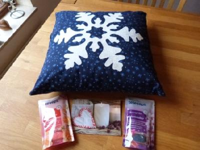 Ein wunderschönes königblaues Kissen mit hellblauen Eiskristallen und einer applizierten Schneeflocke.
