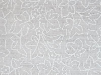 der Stoff ist weiß mit aufgedruckten kräftigeren weißen Linien, die Blätter und vereinzelte Blümchen zeigen